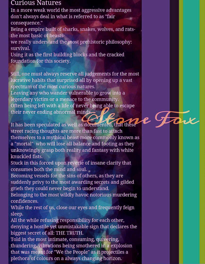 Told in the most intimate, consuming, quivering, thundering, vibrations being smothered in a explosion that was meant for "We the People" as it projects a plethora of colours on a always changing horizon.